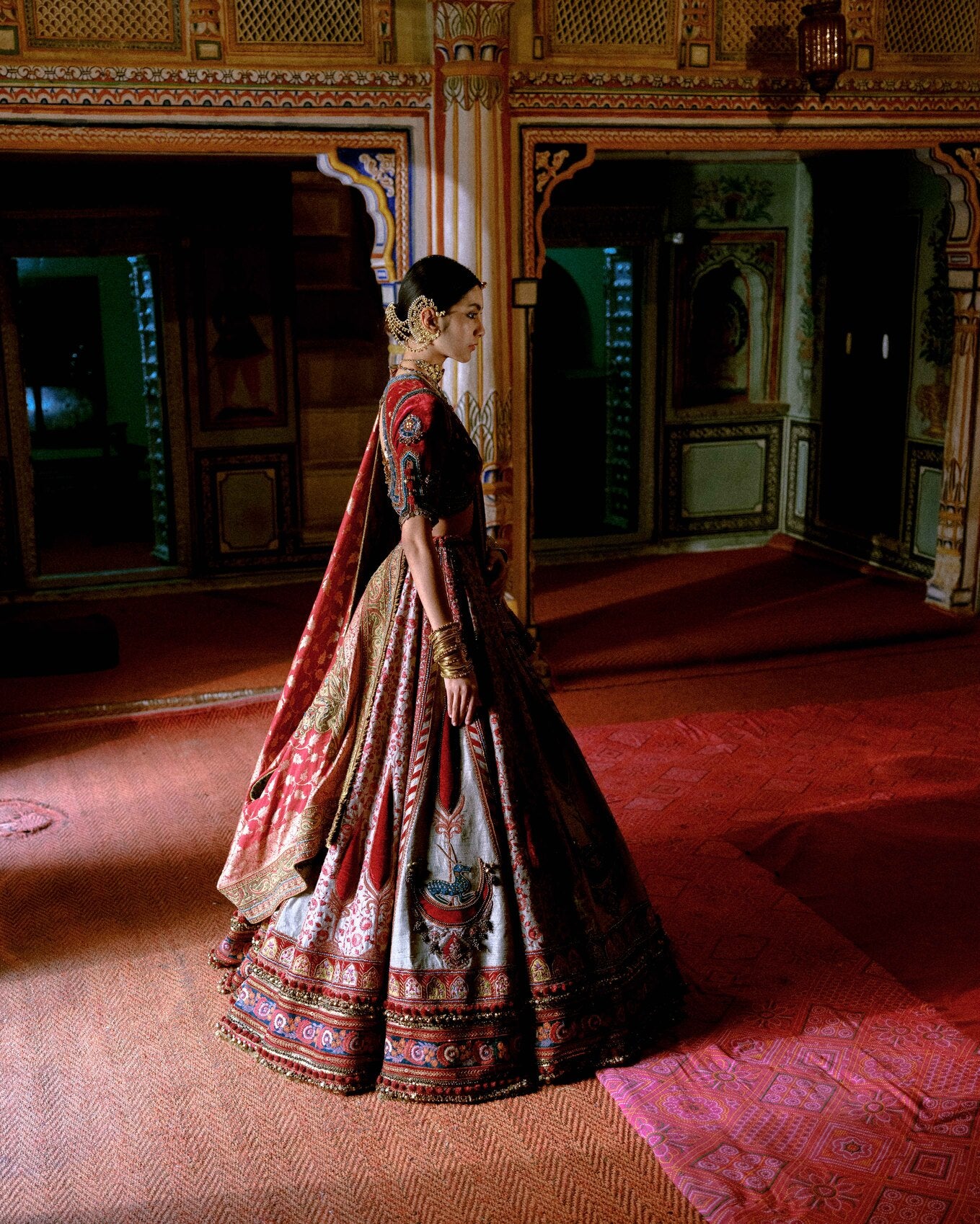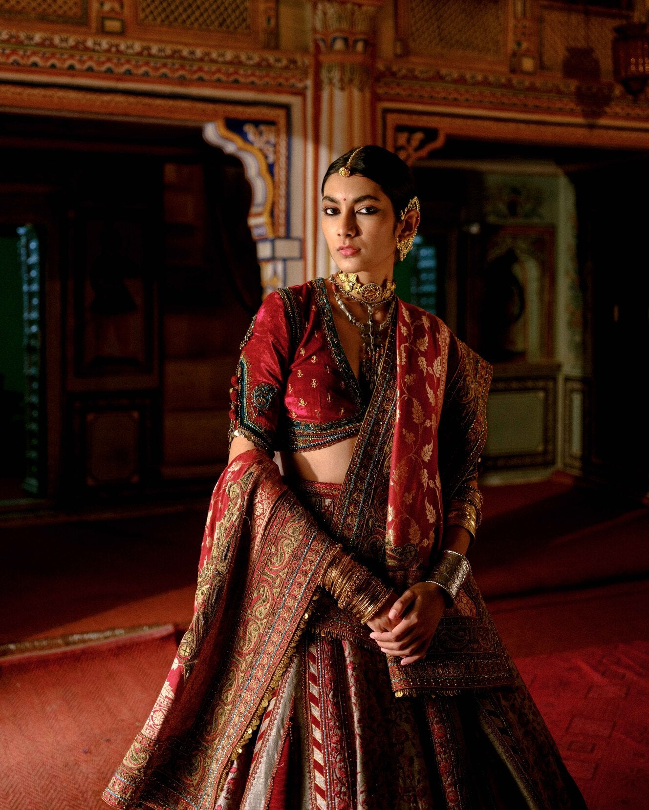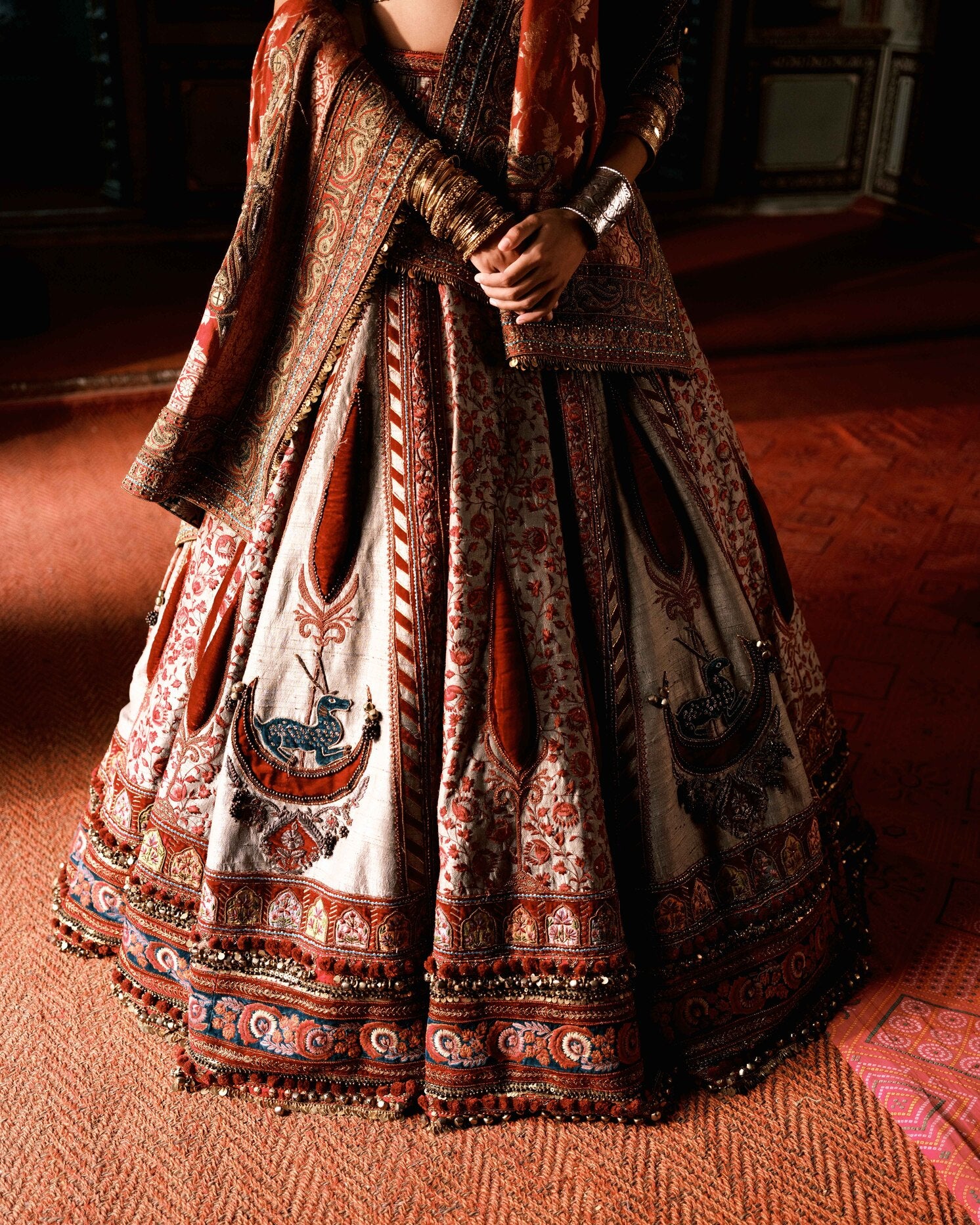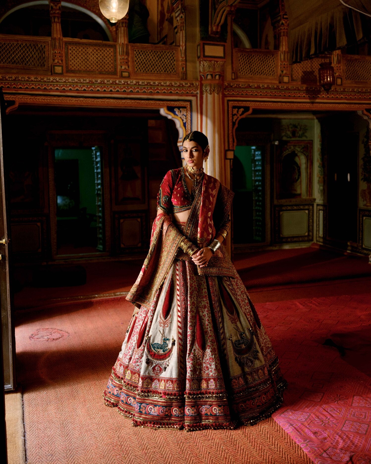 A graceful yet striking ensemble, this oatmeal raw silk lehenga is adorned with a heavy border, elevated with resham, dori & handwork. It is paired with a red velvet blouse and a Banarasi dupatta.