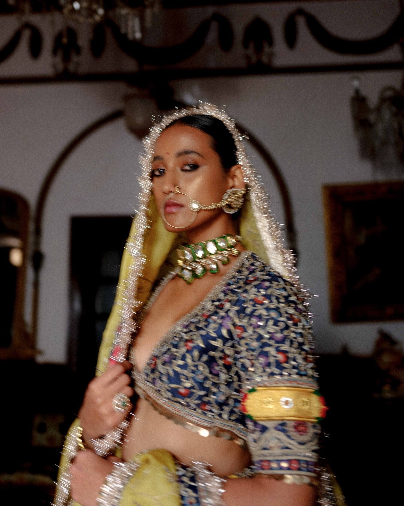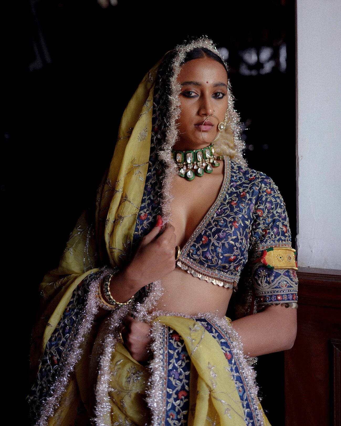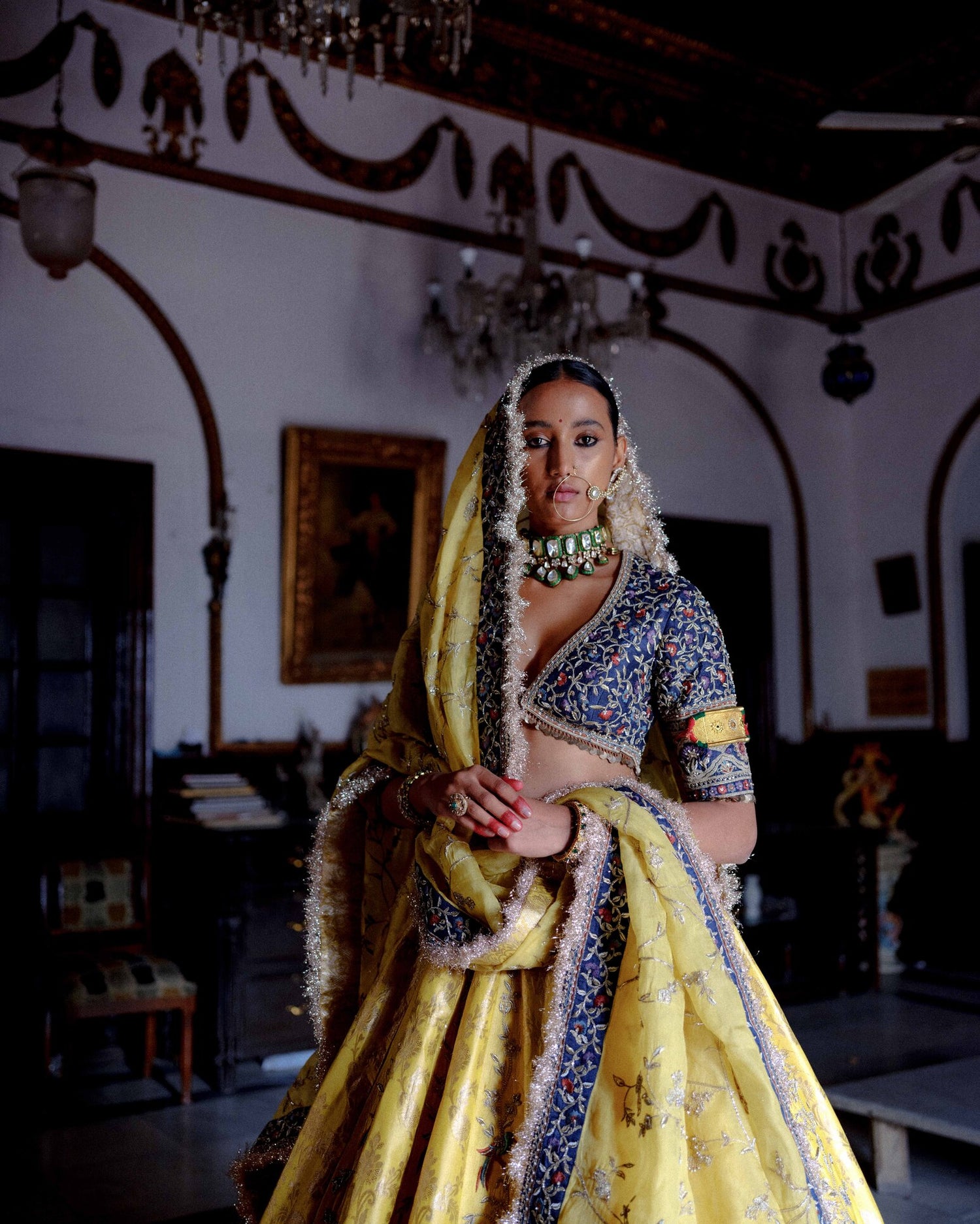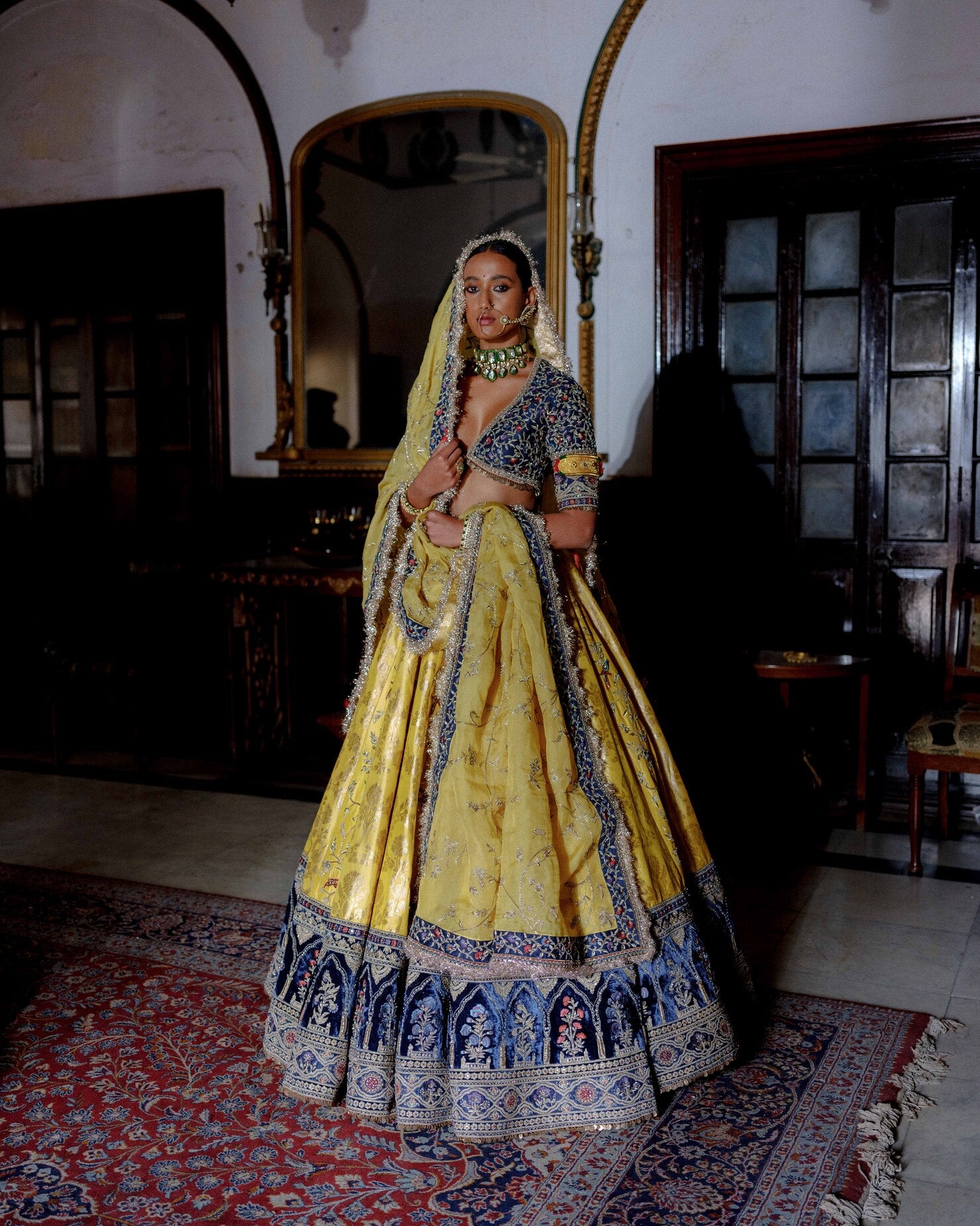 | A vibrant yellow brocade lehenga accented with a rich velvet Mughal border and intricate resham work. Paired with a teal grey raw silk blouse featuring detailed resham and dori embroidery. Finished with an organza dupatta edged in a delicate resham border, completing the festive look. |