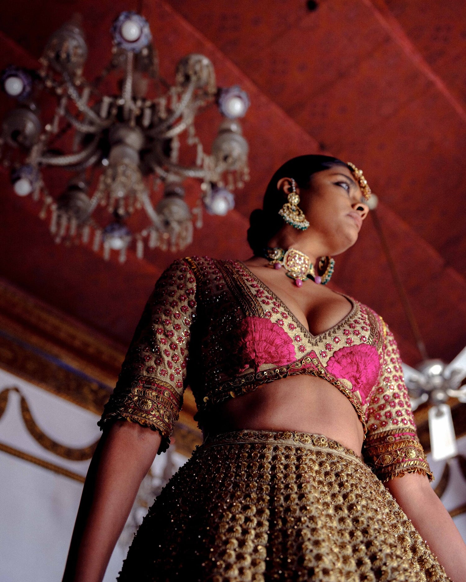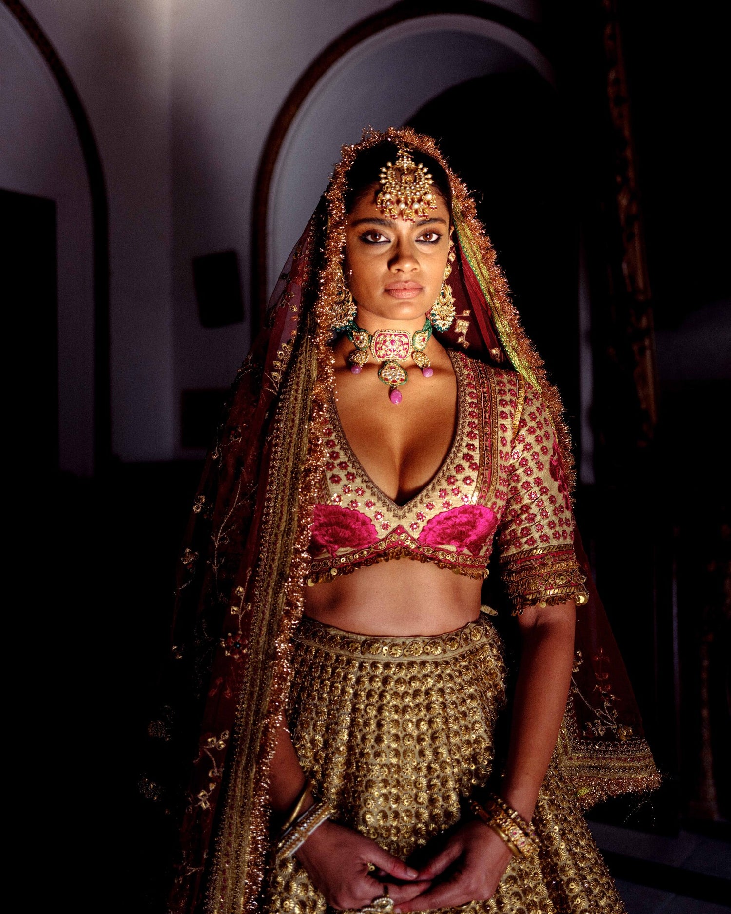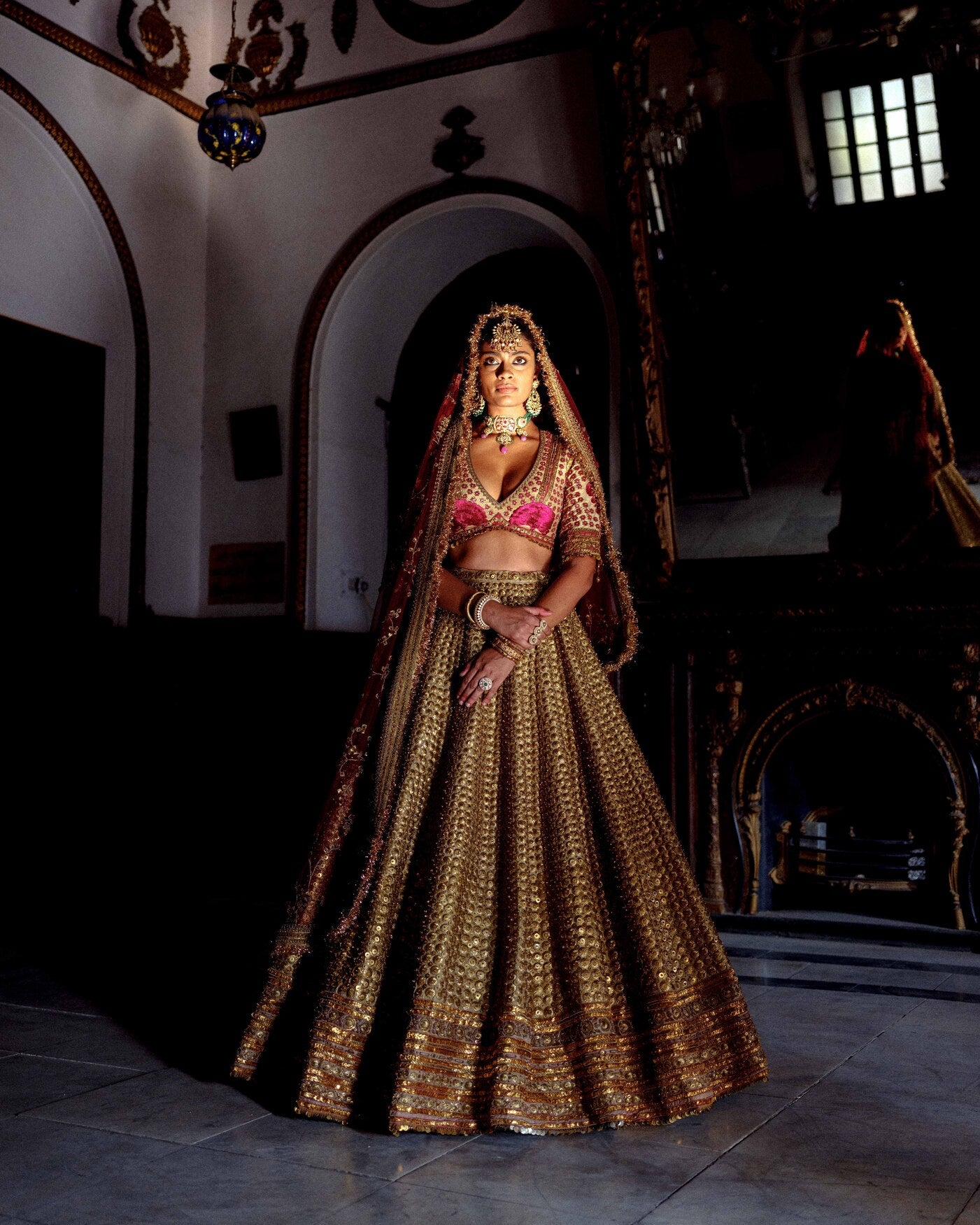 | A soft and ethereal ensemble, this sage green tea-dipped raw silk lehenga is adorned with delicate gota work, creating a subtle festive charm. It is paired with a matching blouse and a georgette dupatta. |