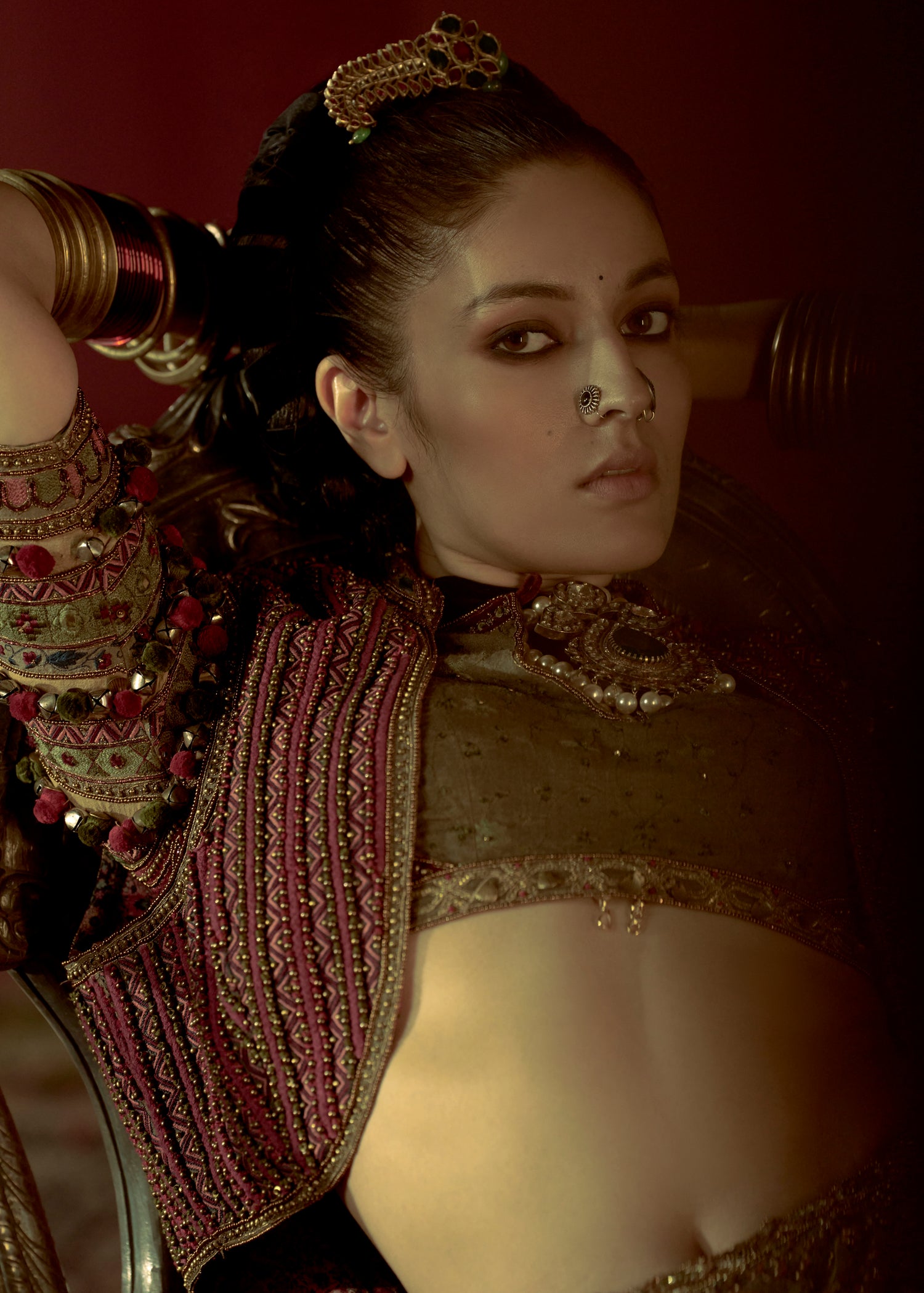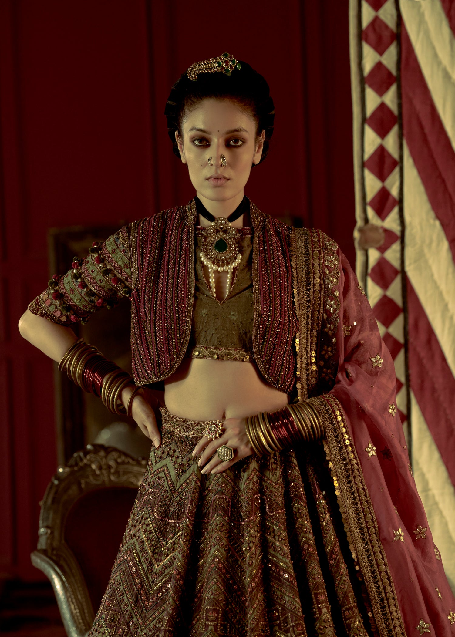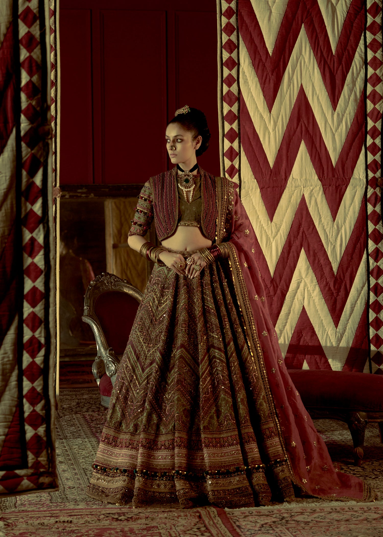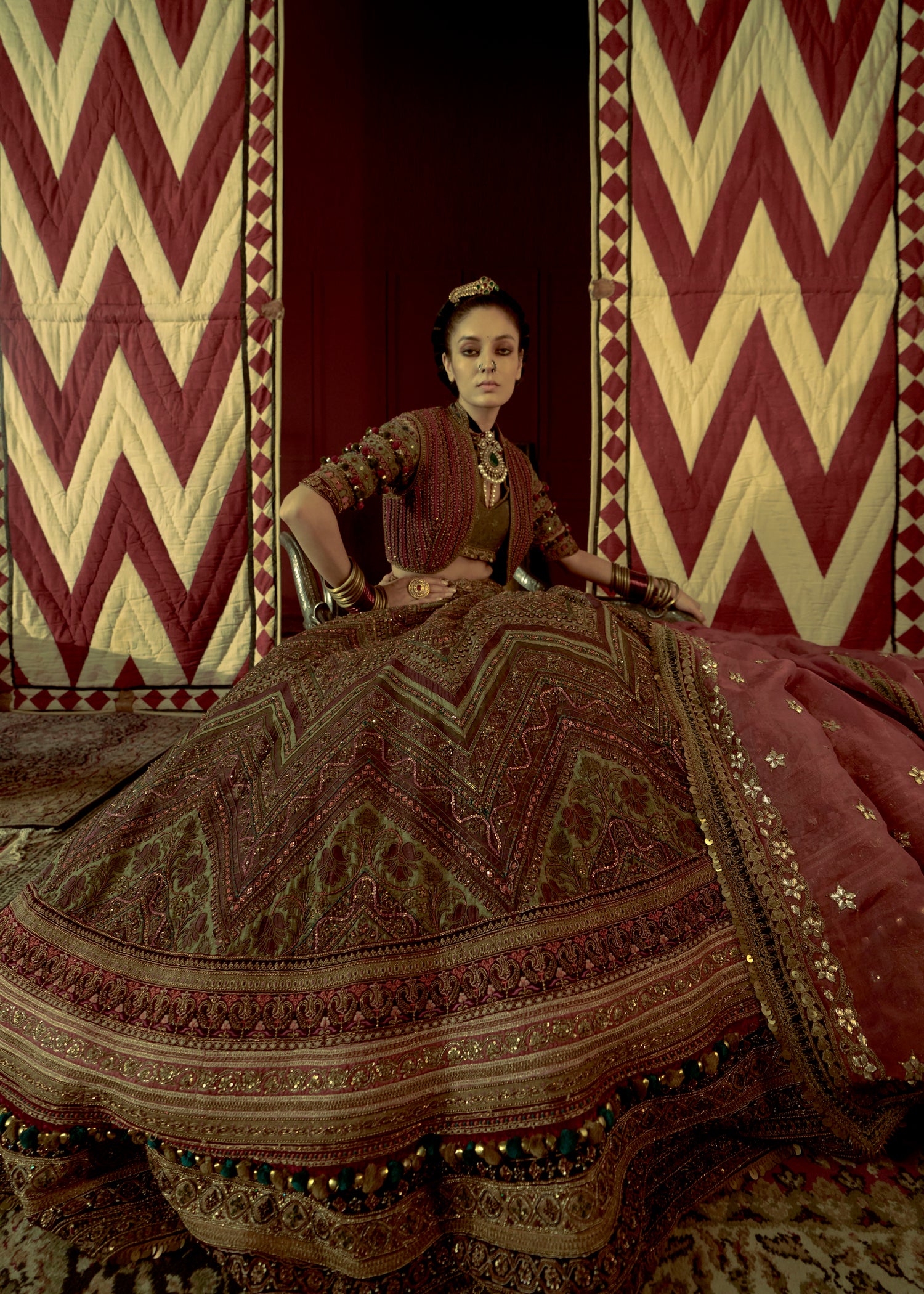 This pista green raw silk lehenga features a ghungroo border and a hot pink sweetheart blouse in Dori and Zardozi. A peach organza dupatta with four-side borders and delicate booti detailing completes this vibrant, festive ensemble.