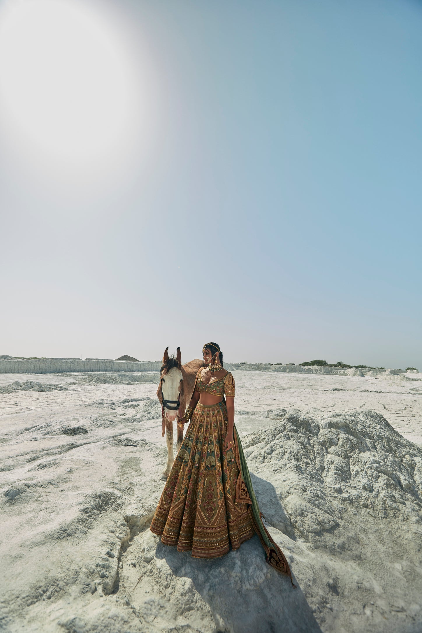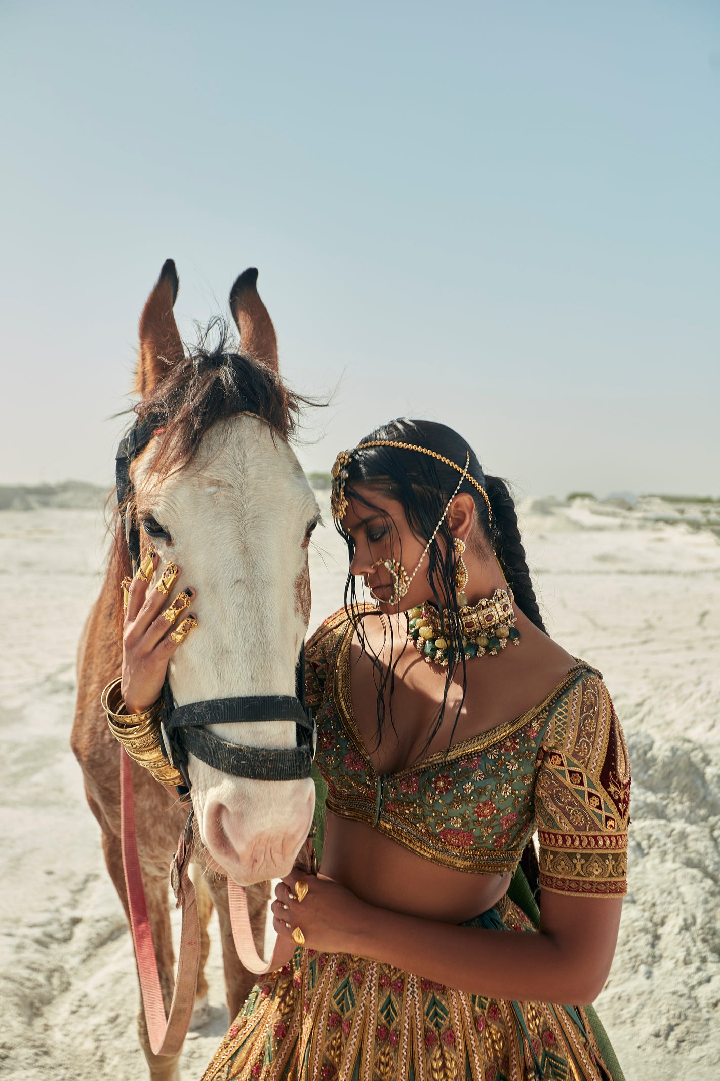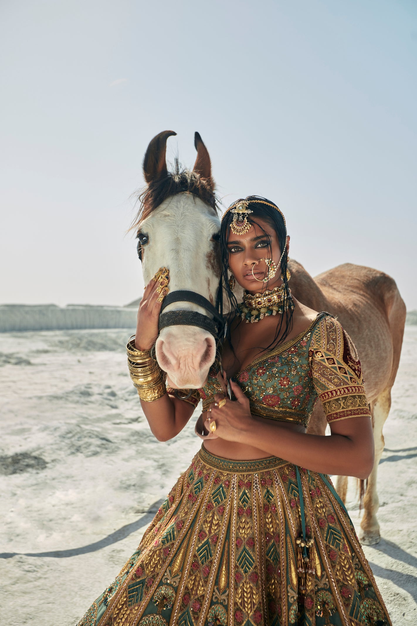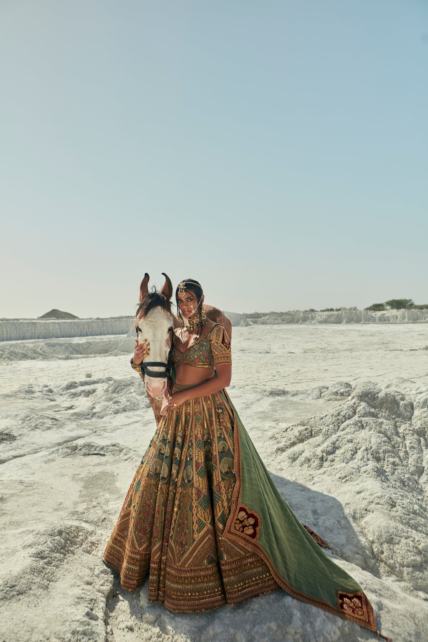 This striking teal blue lehenga features opulent, all-over golden Gota and Zardozi hand-embroidery. The matching blouse is meticulously detailed with Marori and Zardozi work, blending rich heritage craftsmanship with a sophisticated, festive teal silhouette.